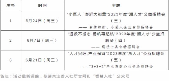 本次“湘人才”公共招聘活動也將同步開設2023年度“湘人才”公共招聘系列活動線上招聘會專區(qū)(www.hnrcsc.com),方便用人單位和求職者隨時登記招聘求職信息,不向用人單位和求職者收取任何費用。