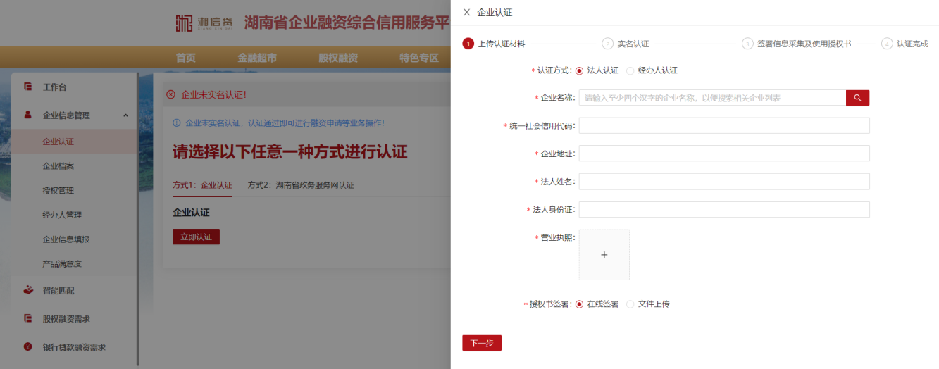 4、在企業(yè)實(shí)名認(rèn)證頁面,選擇認(rèn)證方式(企業(yè)認(rèn)證:需上傳營(yíng)業(yè)執(zhí)照信息,湖南省政務(wù)服務(wù)網(wǎng)認(rèn)證:需在湖南省政務(wù)服務(wù)網(wǎng)開通了賬號(hào)),并按照認(rèn)證流程進(jìn)行操作。