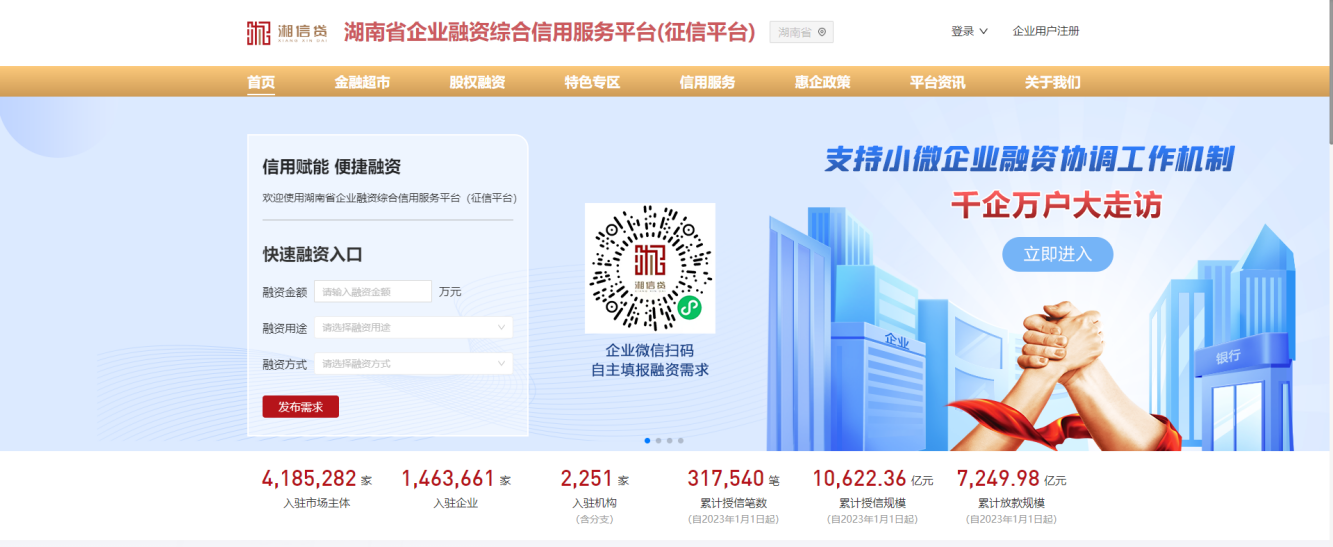 1、電腦瀏覽器輸入“湘信貸”平臺(tái)地址,訪問網(wǎng)站首頁,https://credit.fgw.hunan.gov.cn/xyd。