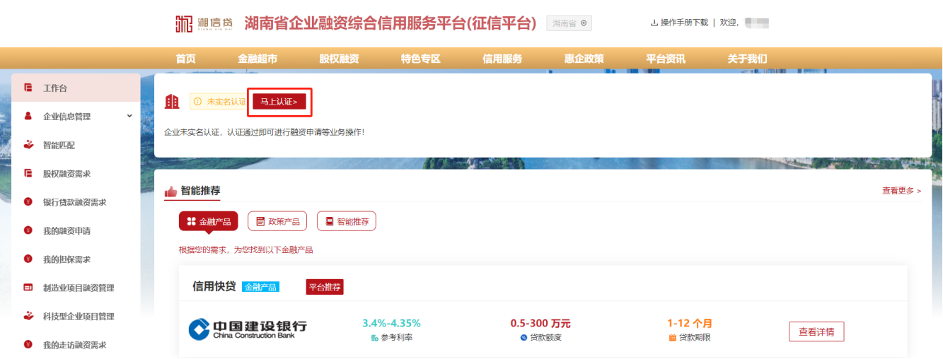 3、注冊(cè)完成登錄企業(yè)后端工作臺(tái)后,點(diǎn)擊頁面“馬上認(rèn)證”按鈕,進(jìn)行企業(yè)實(shí)名認(rèn)證核驗(yàn)。