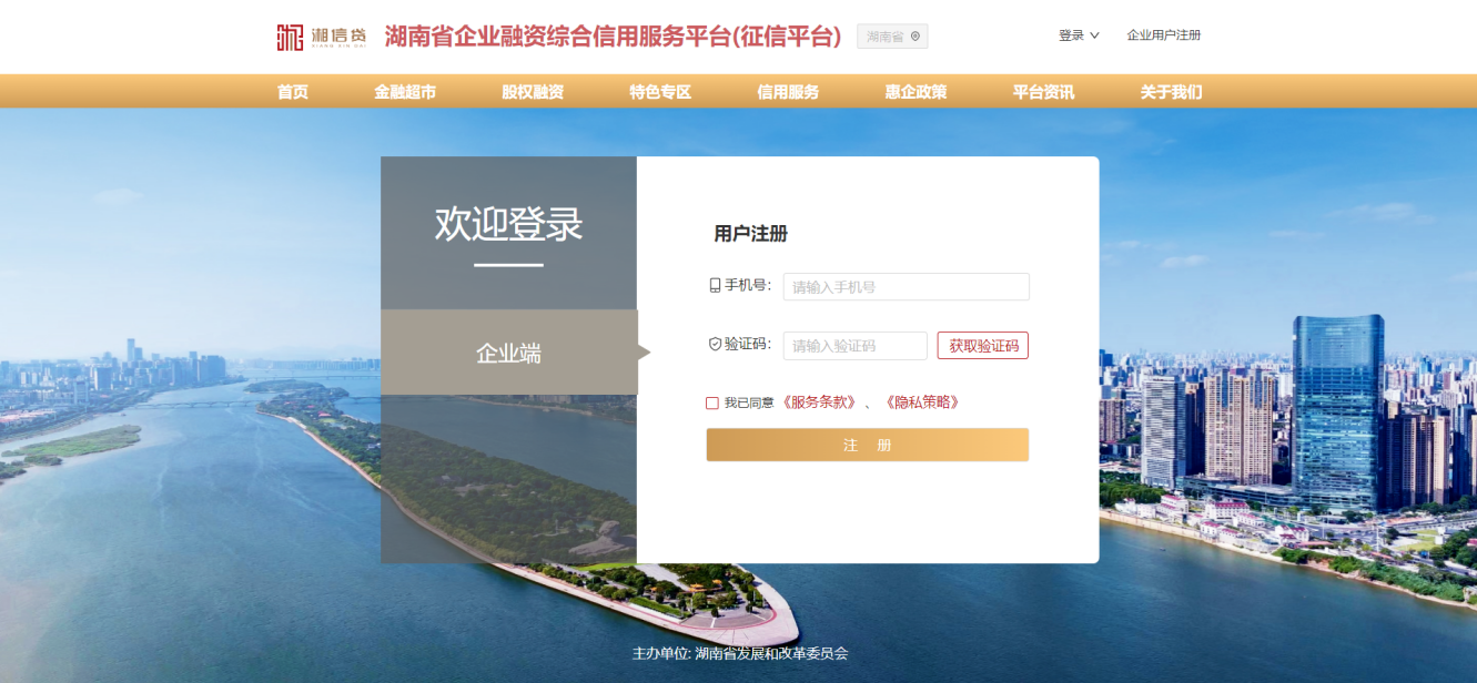 1、在“登錄頁面”左下角點(diǎn)擊“注冊(cè)”按鈕或在“湘信貸”平臺(tái)網(wǎng)站右上角,點(diǎn)擊“企業(yè)用戶注冊(cè)”按鈕,進(jìn)入注冊(cè)頁面。