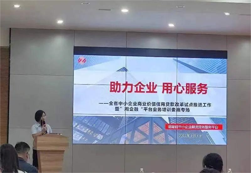 2022年9月6日下午,湖南省中小企業(yè)商業(yè)價值信用貸款改革暨“湘企融”平臺業(yè)務及融資服務能力提升培訓活動在婁底經開區(qū)創(chuàng)新大廈六樓舉行。此次活動由湖南省工信廳指導,省中小企業(yè)服務中心、市工信局主辦,湖南省中小企業(yè)融資股份有限公司承辦,市中小企業(yè)公共服務平臺協辦。